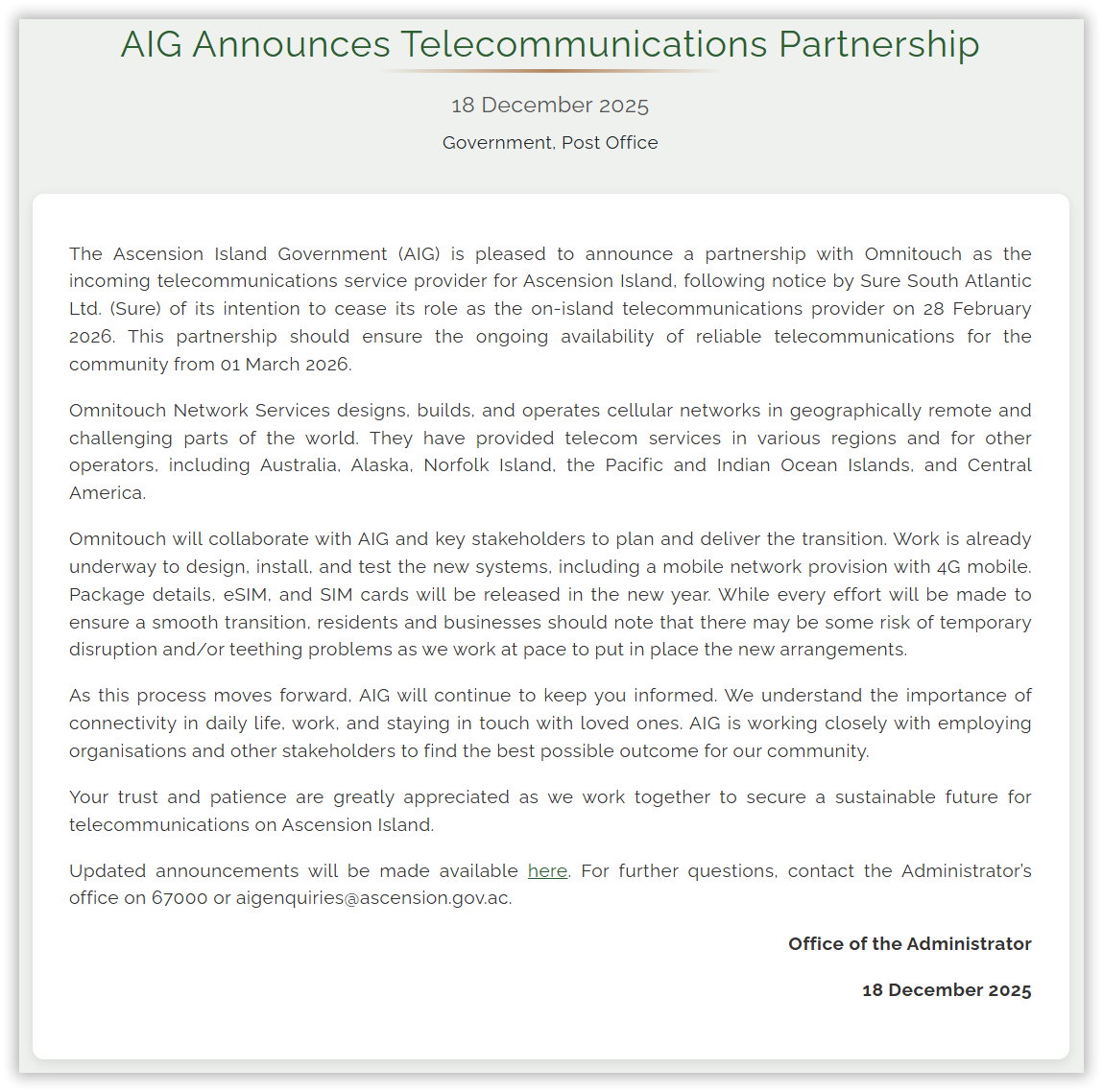 The original 18th December 2025 Ascension Island Government (AIS) press release can be read here.