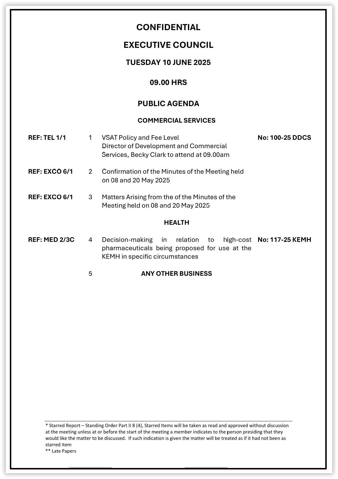 The agenda for the 10th June 2025 ExCo meeting, where final approval for Starlink operation is to be considered.
