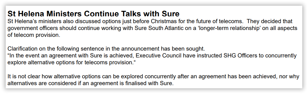 As of the start of 2026, the exclusive telecommunications licence held by Sure South Atlantic in Saint Helena has expired under its original terms, having reached its stated duration on 31 December 2025. However, under the transitional provisions of the new Communications Ordinance, approved by the St Helena Legislative Council in June 2025, all licences issued to Sure South Atlantic under the Telecommunications Ordinance 1989 remain valid and in full force until 31 March 2026.